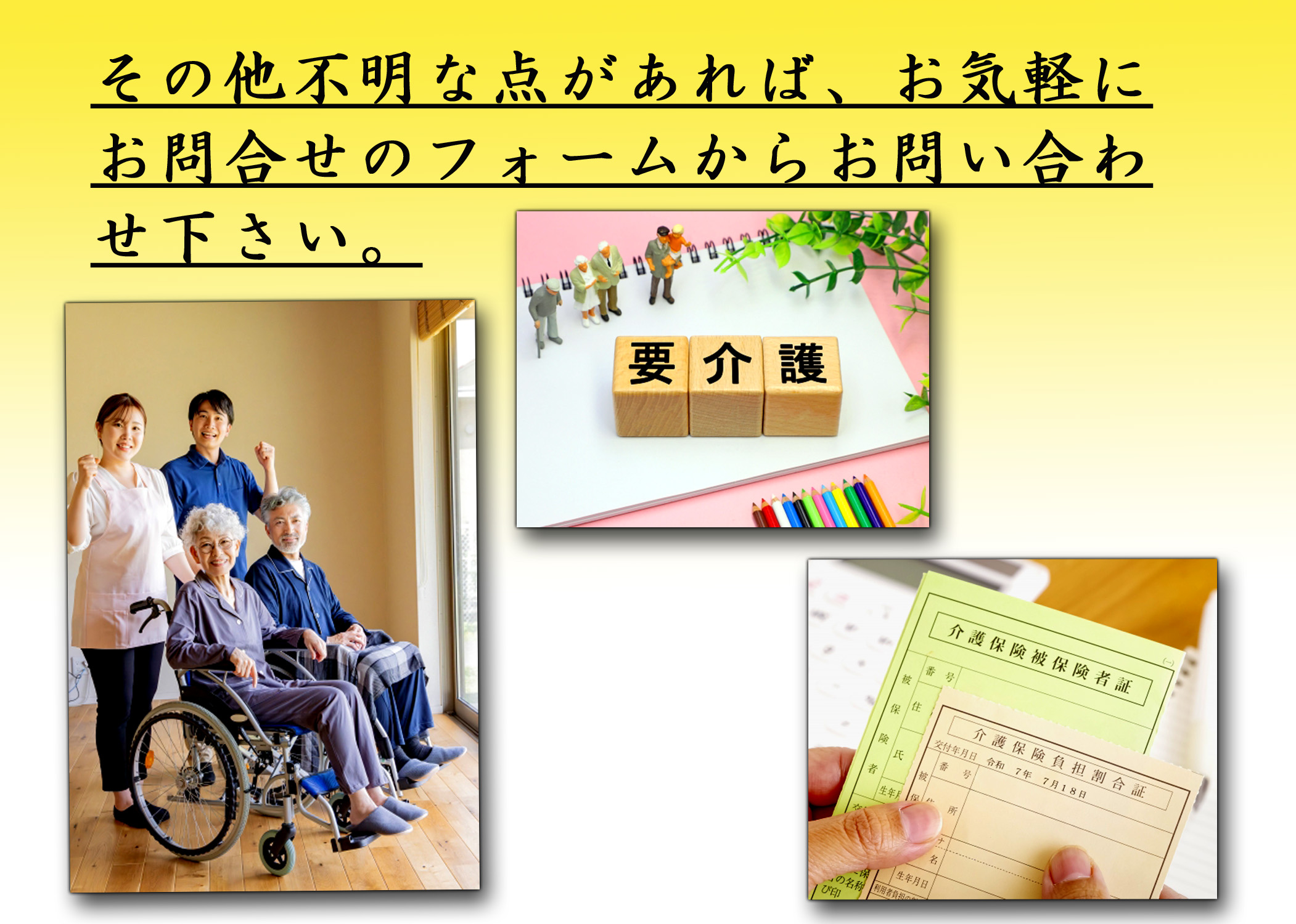 - A : スマイル赤泊入所申請書、介護支援専門員意見書、介護保険被保険者の写し等ですが、詳しくは当施設まで 問い合わせください。